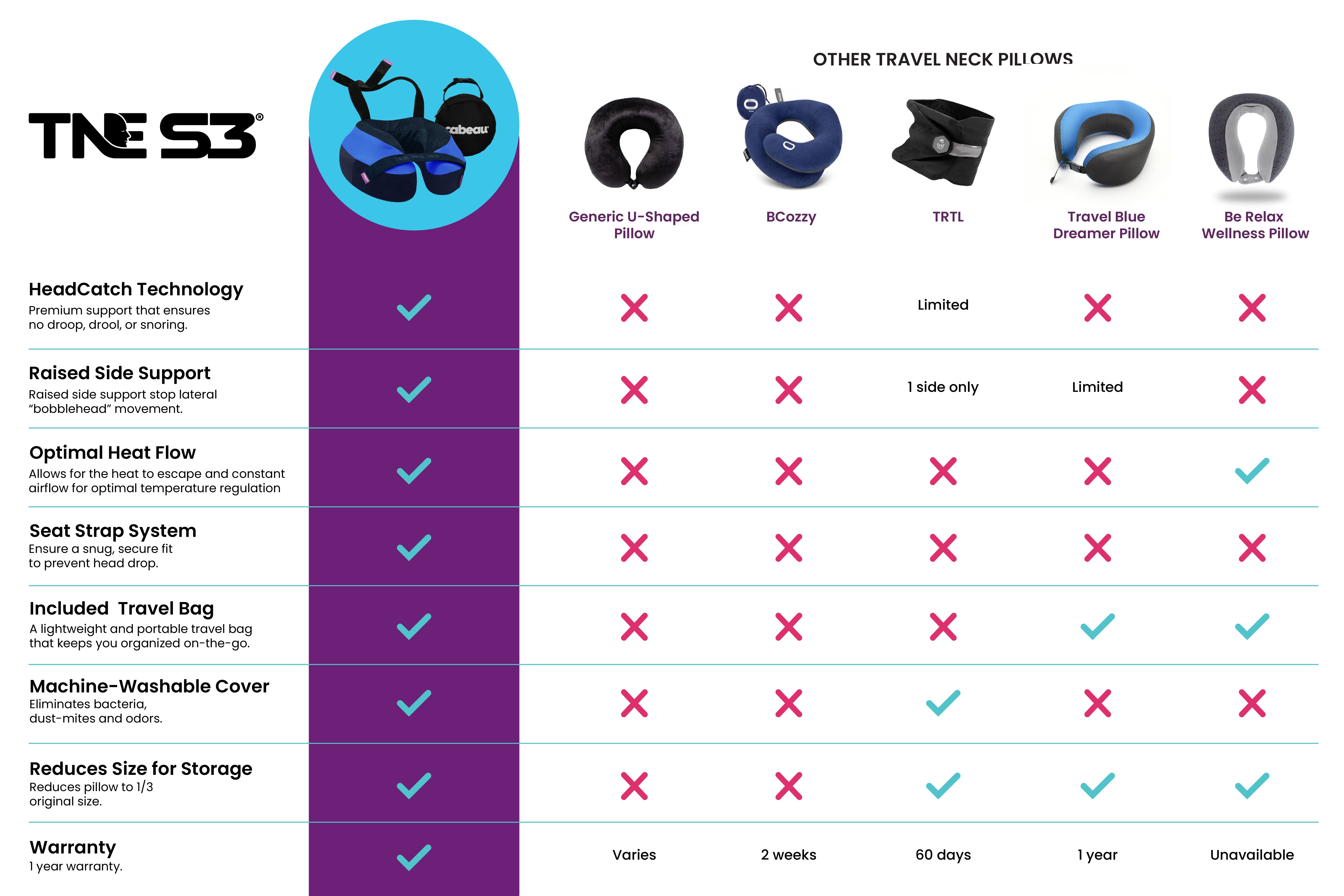 Introducing the ultimate solution to uncomfortable travel: The Neck’s Evolution S3. This revolutionary travel pillow features our globally patented HeadCatch Technology innovation: the comfiest, most secure, gravity defying technology that allows for maximum head and neck support at all angles, while cleverly leaving a large opening at the front of the neck for heat to escape. The only pillow that contour one’s jawline without gaps like an egg carton does to an egg. Your head falling forward while trying to sleep on a plane is now a thing of the past! The Neck’s Evolution S3 also includes our revolutionary raised side supports and seat strap system that keeps your head in place as you drift off to sleep – and stay that way - on flights and on all high-back seats.